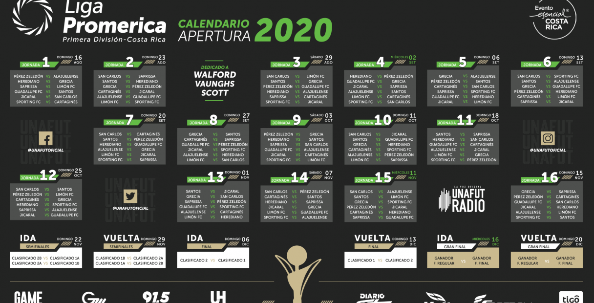 UNAFUT anunció este miércoles el calendario del Apertura 2020 de la Liga Promerica, un cronograma que cumple con todos los parámetros solicitados por los clubes tras el cambio de formato de competición para dicho certamen.